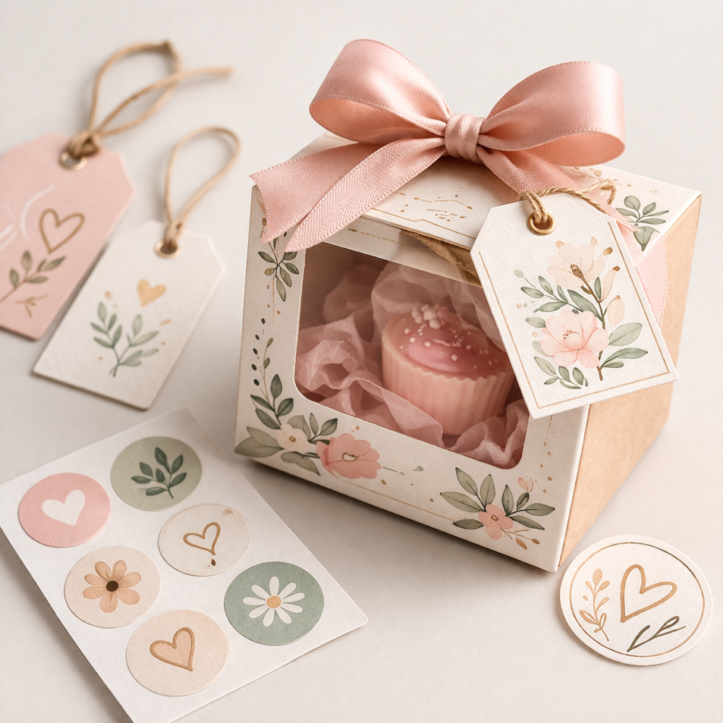 Tags, adesivos, detalhes pra deixar a caixa mais premium