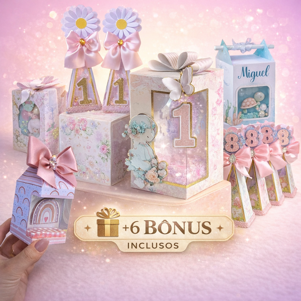 Você recebe arquivos digitais prontos de caixas com visor, com moldes e artes editáveis no Canva para personalizar, imprimir e montar.
